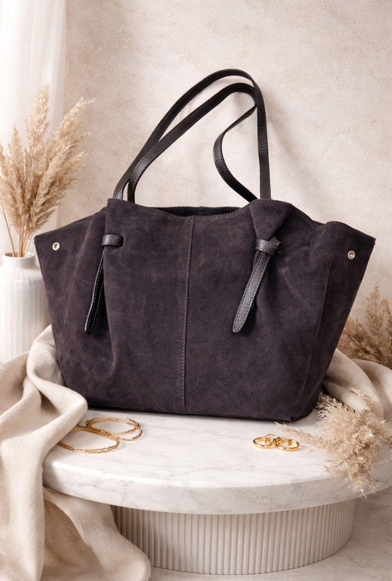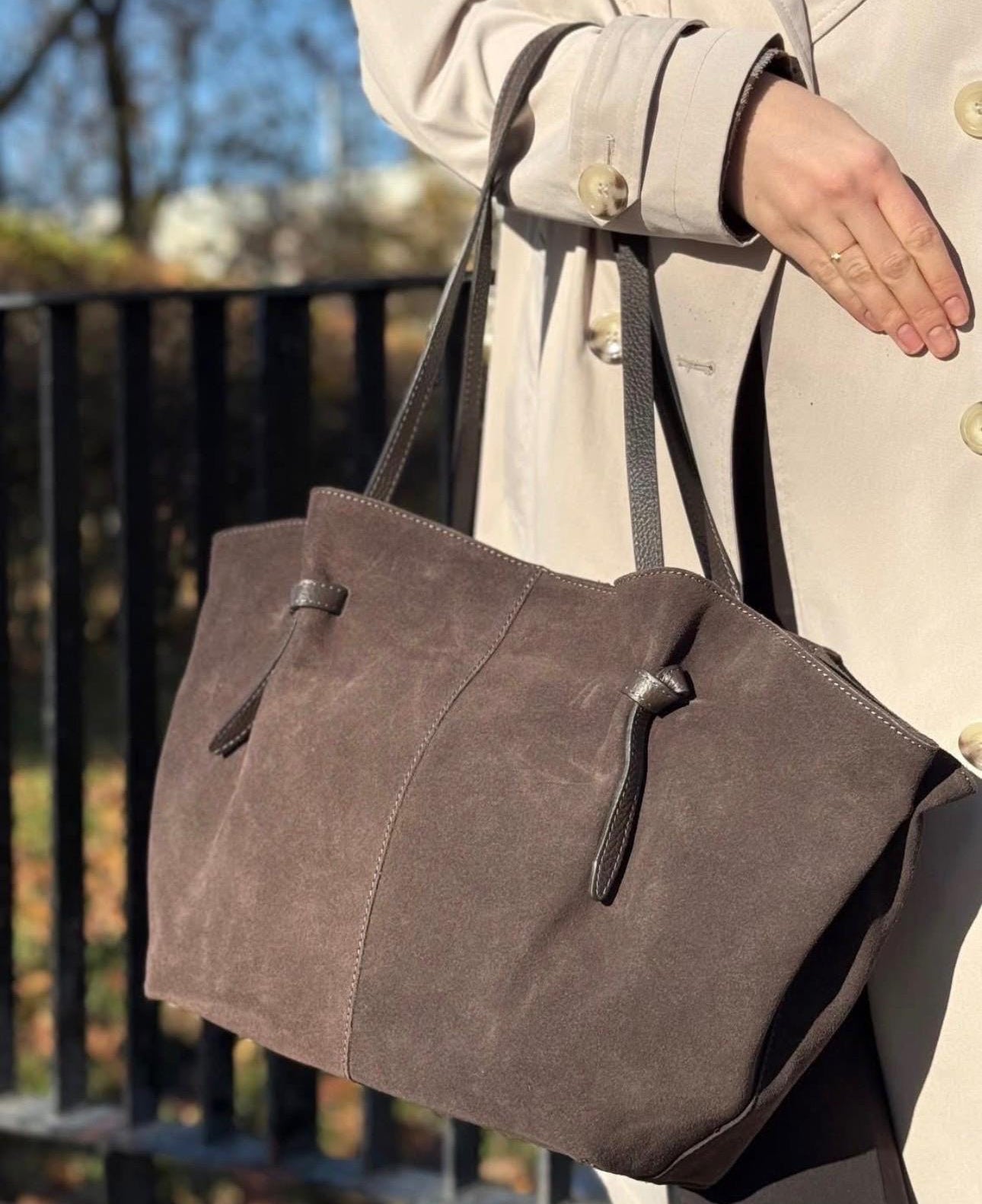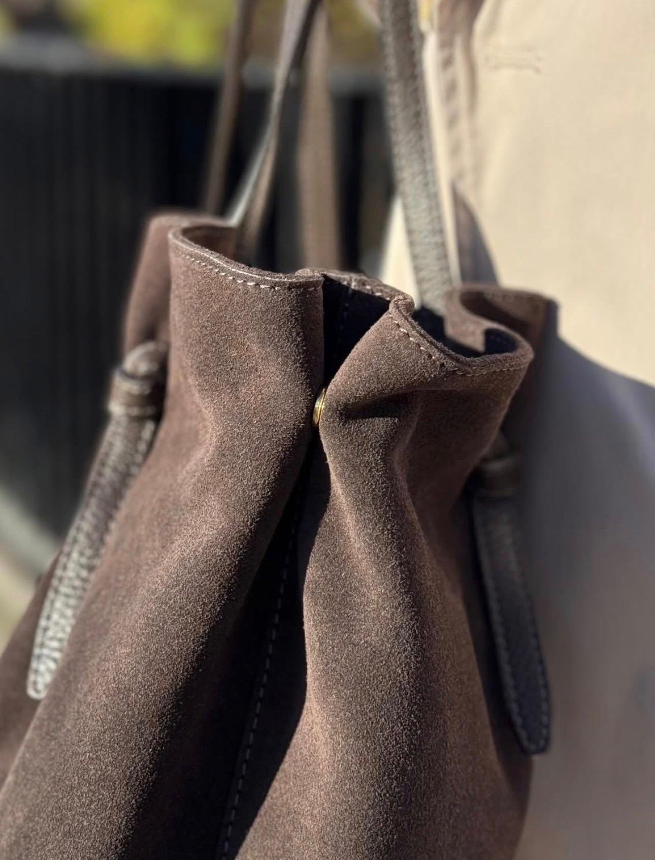 Elegancka duża torebka z naturalnej zamszowej skóry, wykonana we Włoszech. Uniwersalny kolor ciemny brąz o głębokim, czekoladowym odcieniu doskonale komponuje się z każdą stylizacją. Pojemne wnętrze (55×29×13 cm) pomieści wszystkie niezbędne przedmioty na co dzień. W zestawie regulowany pasek o długości około 115 cm, umożliwiający noszenie na ramieniu. Naturalna zamszowa skóra gwarantuje trwałość i wyjątkowy wygląd, który z czasem nabiera charakteru. Idealna dla wymagających kobiet ceniących jakość i ponadczasowy design.
