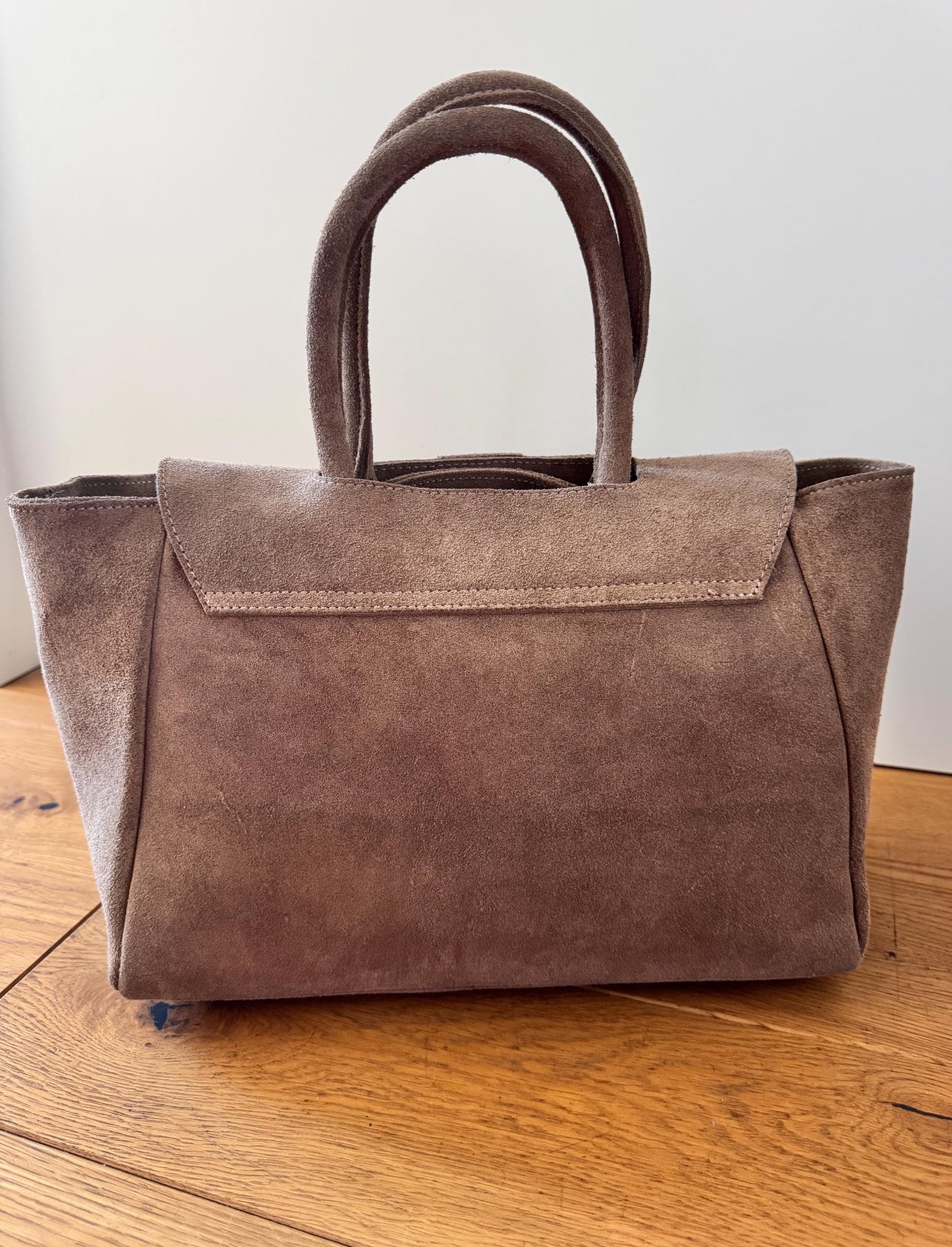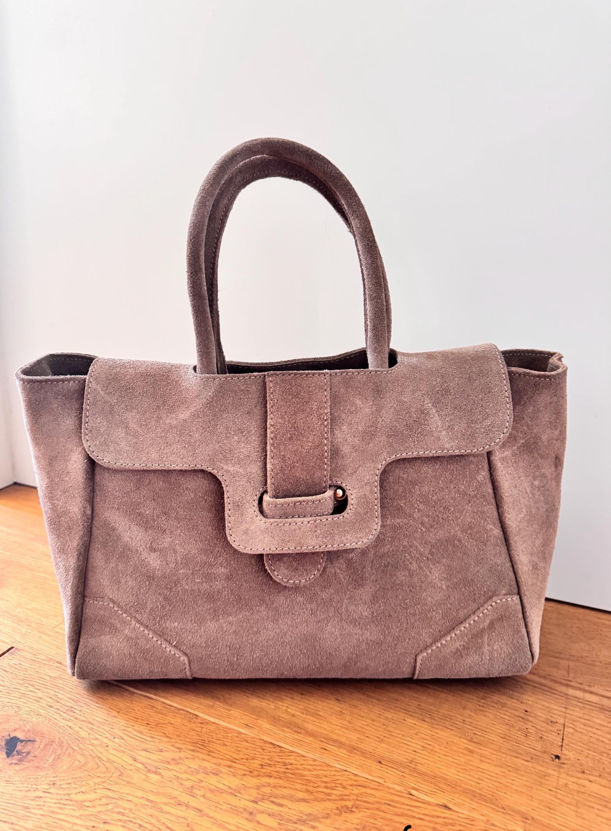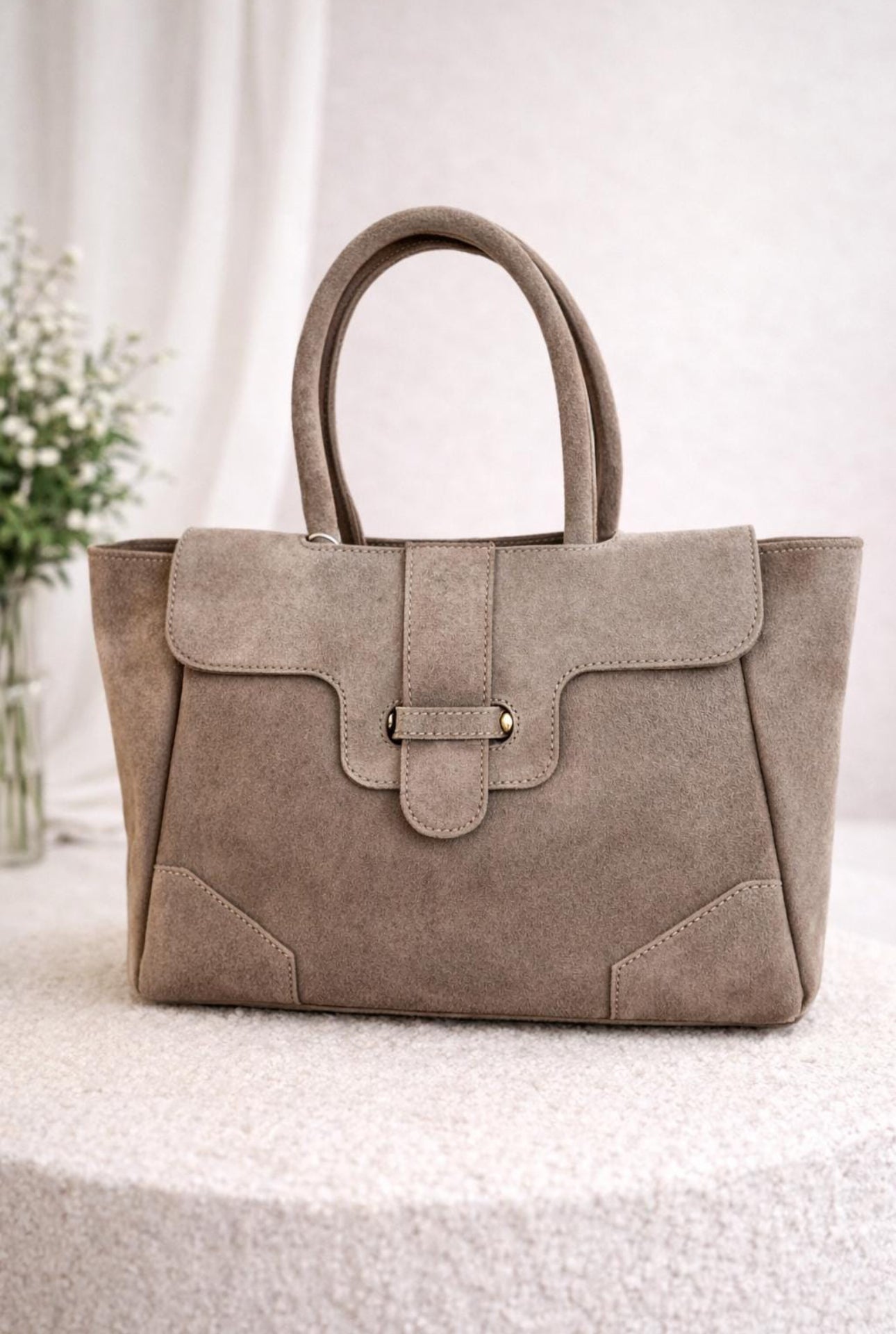 Elegancka torebka shoper z naturalnej zamszowej skóry, wykonana we Włoszech. Uniwersalny beżowy odcień Mocha doskonale komponuje się z każdą stylizacją. Spaciowe wnętrze (39 x 22 x 12 cm) pomieści wszystkie niezbędne przedmioty na co dzień. Miękki, przyjemny w dotyku zamsz to gwarancja komfortu i trwałości. W zestawie regulowany pasek o długości około 115 cm, umożliwiający noszenie na ramieniu. Idealna dla tych, którzy cenią sobie jakość materiałów i ponadczasowy design.