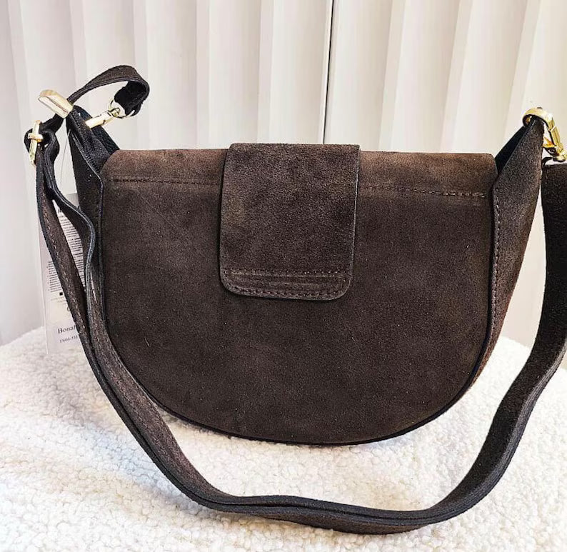 Zamszowa czekoladowa torebka premium. Made in Italy. Klasyczna mała torebka w uniwersalnej odsłonie. - naturalna skóra zamszowa - kolor ciemny brąz, czekoladowy Wymiary: - szerokość 20 cm - wysokość 15 cm - głębokość 7,5 cm W komplecie klasyczny regulowany pasek, długość ok. 125 cm.